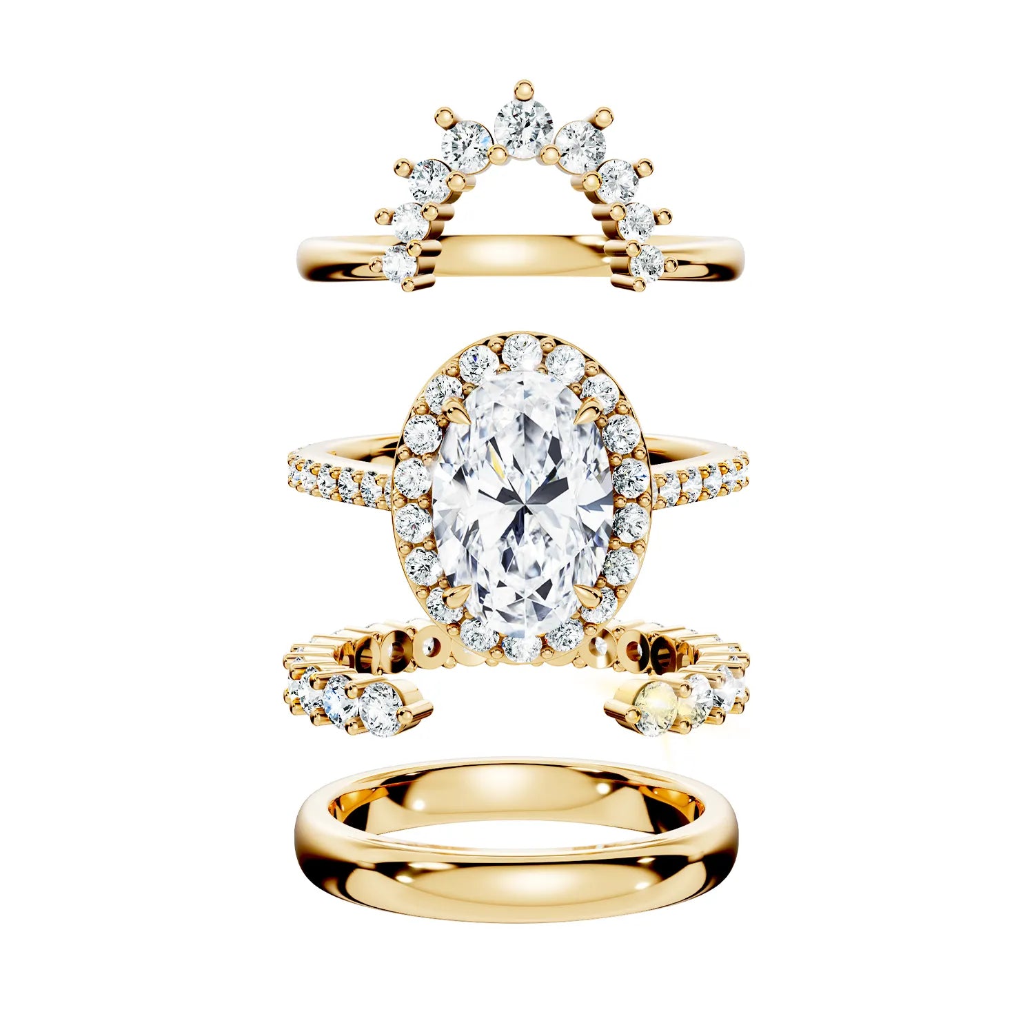 Une bague centrale ornée d’un diamant ovale majestueux, véritable pièce maîtresse.